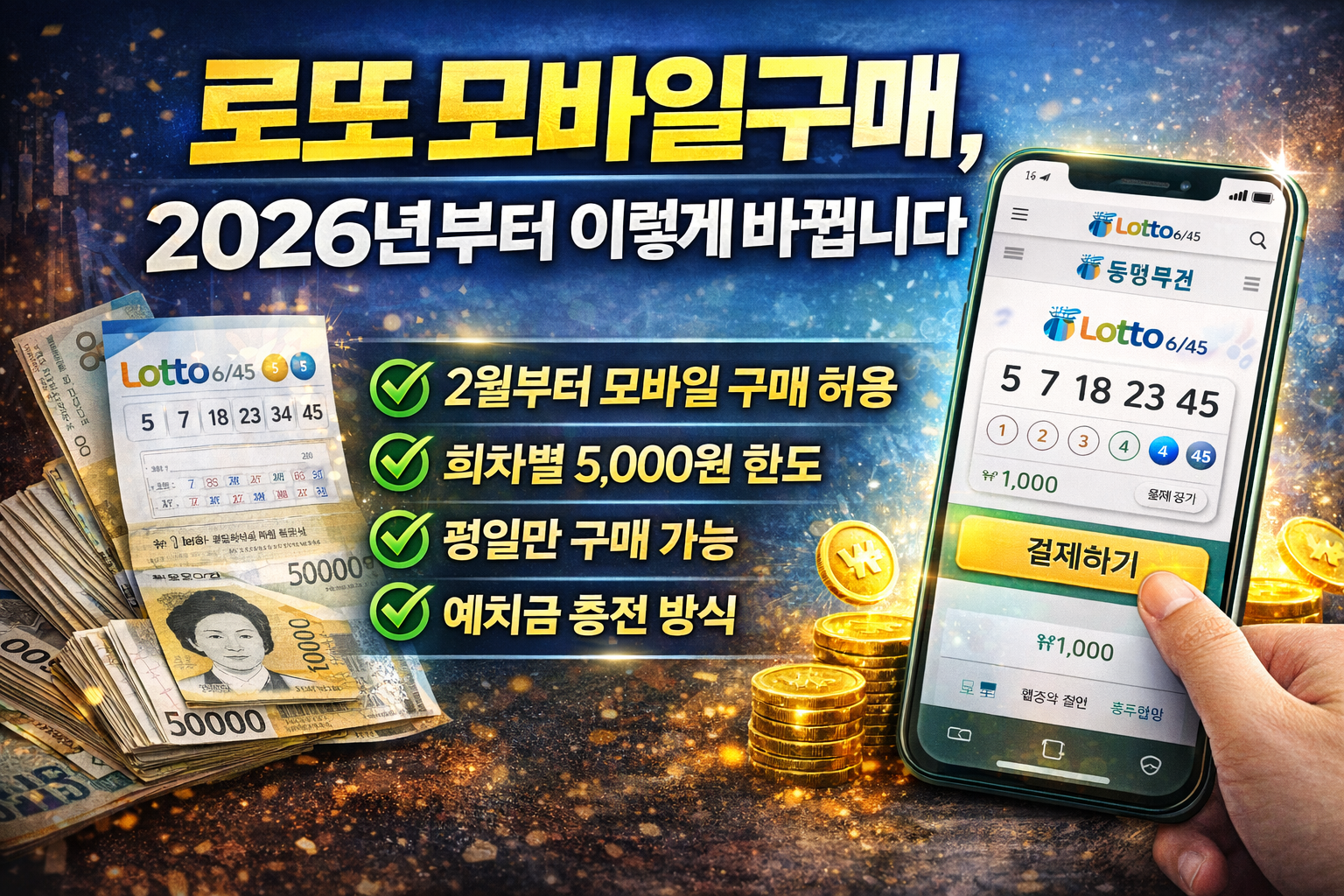로또 모바일구매가 2026년 2월부터 공식 허용되면서 이제는 편의점에 줄 서지 않아도 스마트폰으로 로또 6/45를 직접 구매할 수 있습니다. 구매 방법, 5,000원 한도, 평일 구매 조건까지 꼭 알아야 할 핵심 내용만 정리해드립니다.
