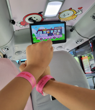- 증기기관차를 모티브로 한 독특한 디자인, 분홍색 캐릭터 버스