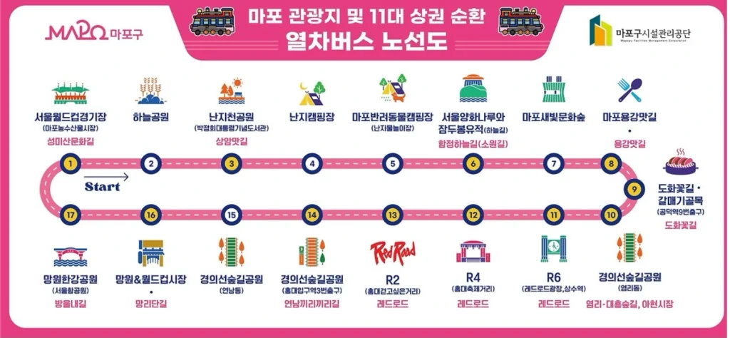 마포순환열차버스는 마포구 중심 골목과 명소 17곳을 순환 운행합니다.