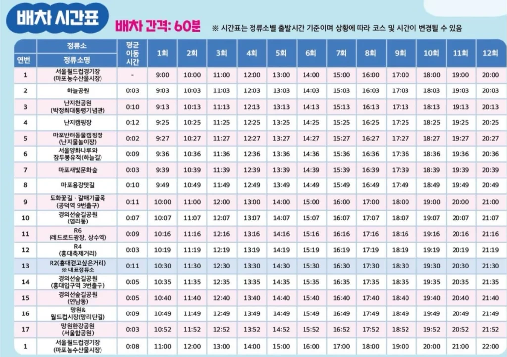 마포순환열차버스 운행 시간표 및 배차 간격 (25년 7월 기준)