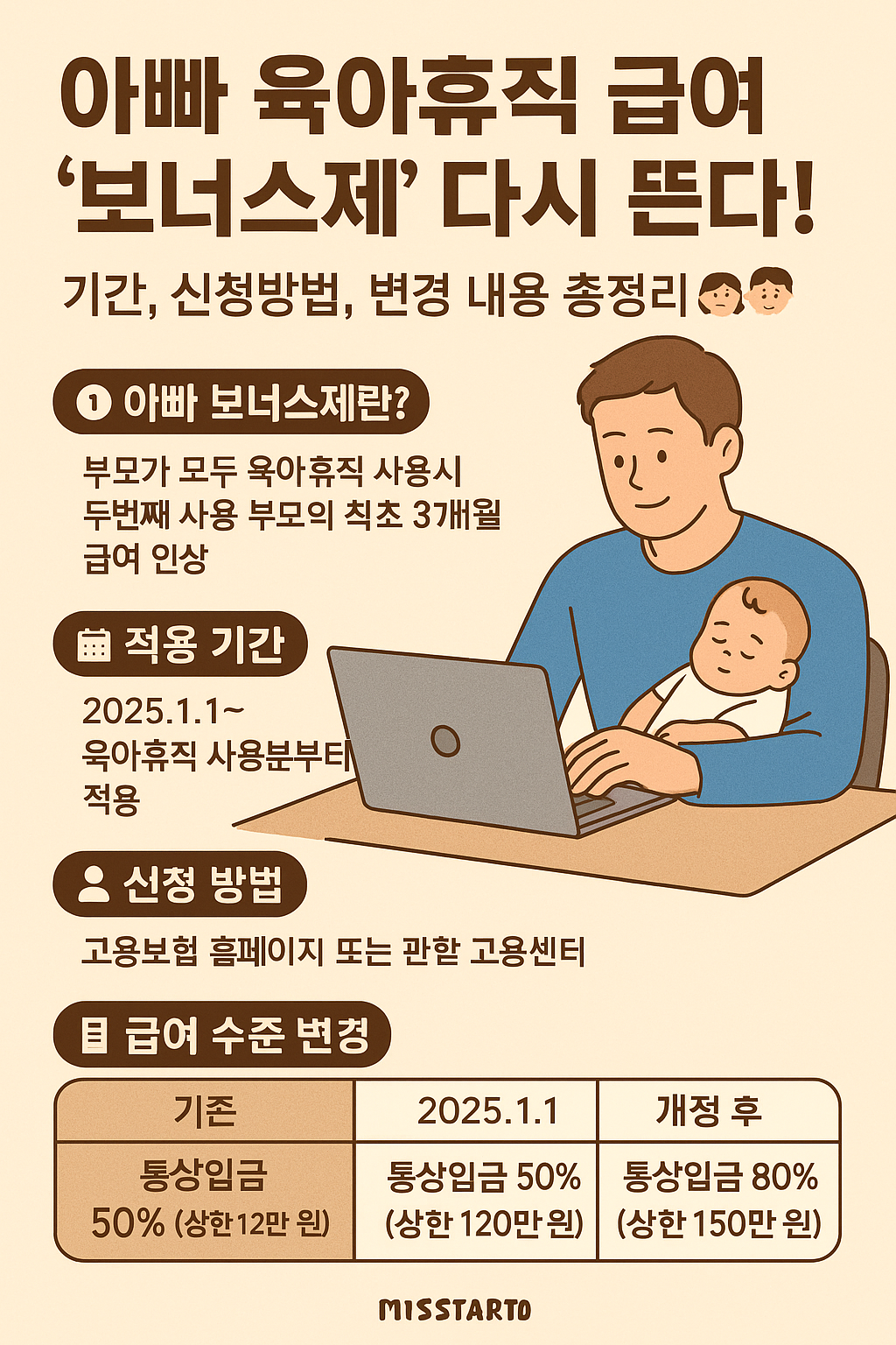 그래서 2025년부터는 아빠 보너스제 급여도 일반 육아휴직과 동일하게 인상된답니다!👏